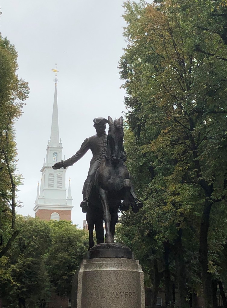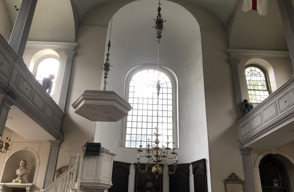 After the house, we walked along Paul’s “midnight ride” route to the Old North Church. We bought tickets in advance for admission. It was very crowded as there was a singing group from Texas there at the same time. Without premium admission tickets, you can only see the first level. Yet, the lanterns for “one if by land, two if by sea” are not there anymore because unfortunately they have deteriorated over the years. What we found most unique about the church was the pews. Instead of in typical long rows, each section was its own segmented square.
